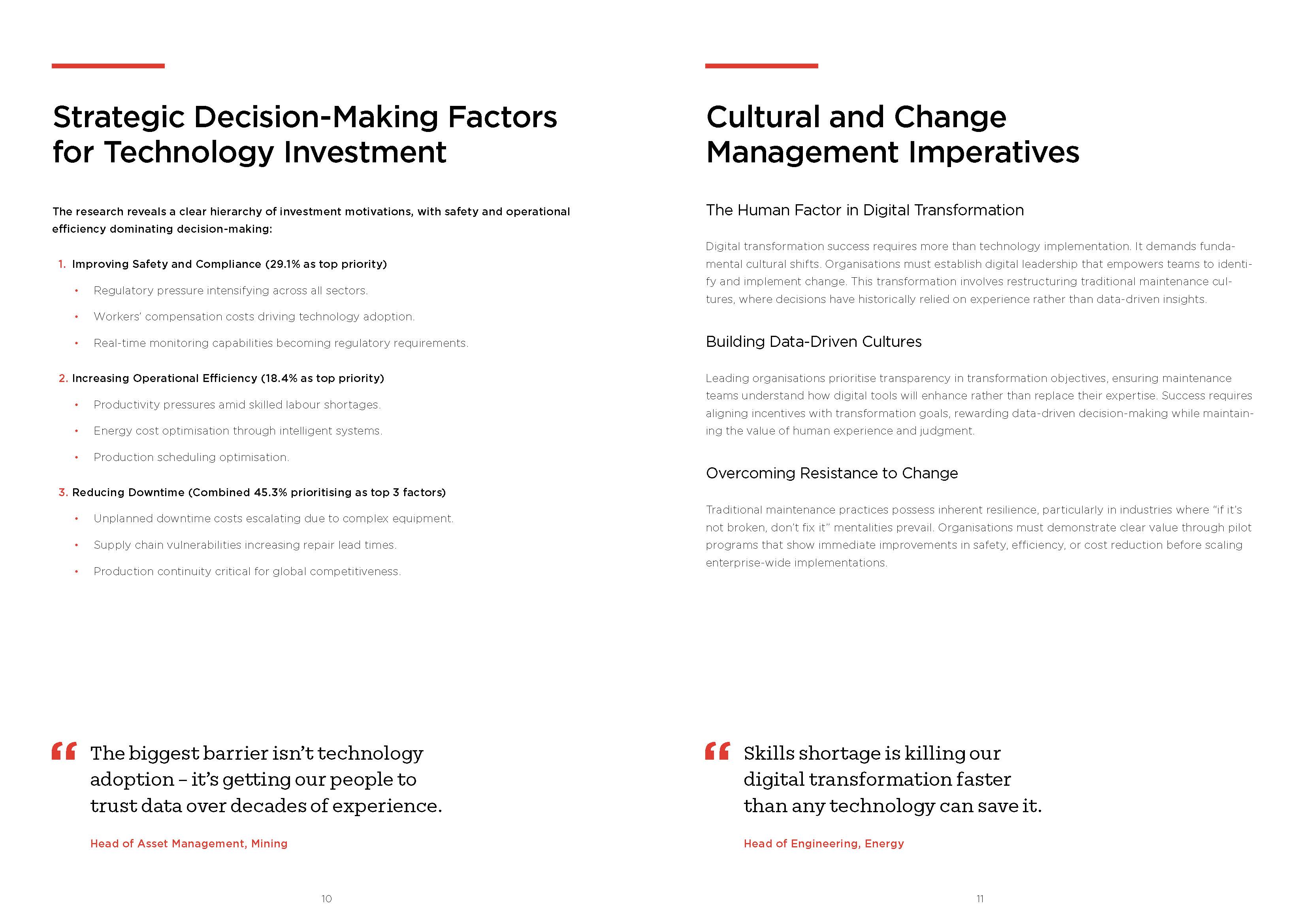 The insights gathered in this report enable Asset Management leaders to benchmark their digital maturity against industry peers, understand proven implementation strategies, and make informed investment decisions that drive measurable improvements in safety, efficiency, and asset performance across their maintenance operations.